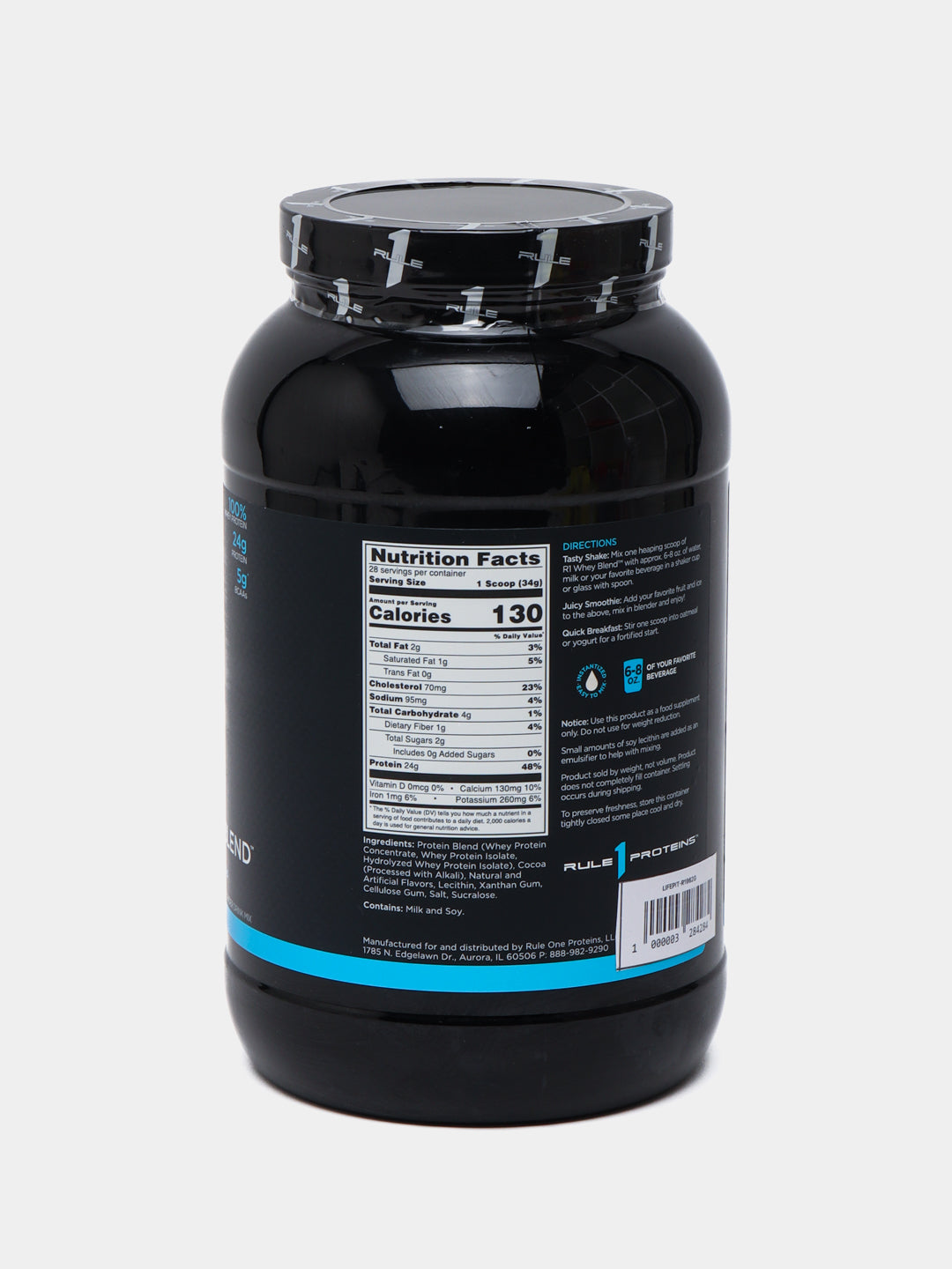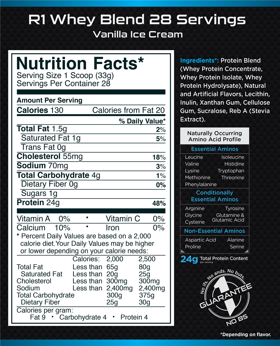 R1 Whey Blend three-whey formula offers the perfect mix of nutritional quality and great taste. Made with 100% Whey Protein from whey concentrates, isolates, and hydrolysates, each scoop provides 24 grams of protein packed with naturally occurring EAAs, BCAAs, and glutamine.